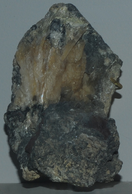 This sample of mendipite is displayed in the Smithsonian Museum of Natural History. Mendipite is a chloride of lead with the composition Pb3O2Cl2. The sample at left is about 7 cm across and is from Mendip Hills, Somerset, England. It is described as mendipite with cerussite and galena. The mendipite is typically colorless to white or gray.