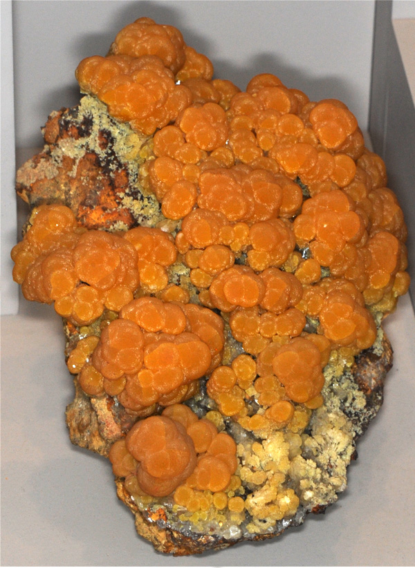 This sample of mimetite is displayed in the Smithsonian Museum of Natural History. Mimetite contains lead, arsenic and chlorine with the composition Pb5(AsO4)3Cl. This sample is about 5x5 cm and is from Tsumeb, Namibia.