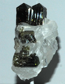 | Vesuvianite|   |   |  Vesuvianite is a silicate mineral with the composition Ca19Fe(Mg,Al)8Al4(SiO4)10(Si2O7)4(OH)10. It contains 6 of the big 8 elements of the Earth's surface. The sample at far left is about 2.5x5 cm and is from Jeffrey mine, Asbestos, Quebec, Canada. The sample near left is about 2x3 cm and is from Eden Hills, Vermont. These samples are displayed in the Smithsonian Museum of Natural History.  |