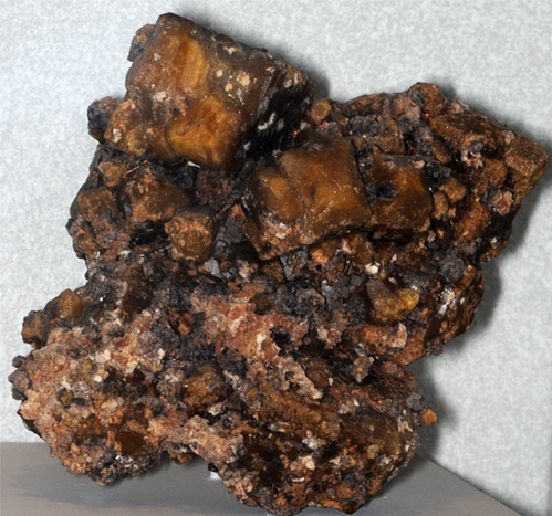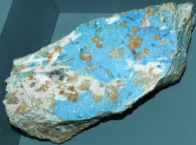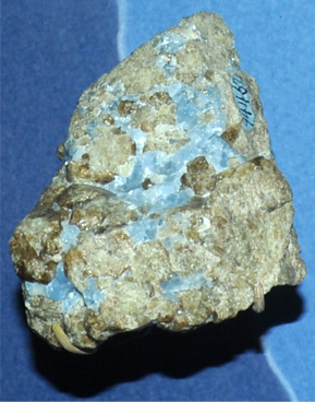 | The vesuvianite sample at right is about 5x7 cm and is from Sanford, Maine. The sample below is described as brown vesuvianite with blue calcite. It is about 6 cm wide. It is from Crestmore, California and identified as being from the Cretacious period.    |  |