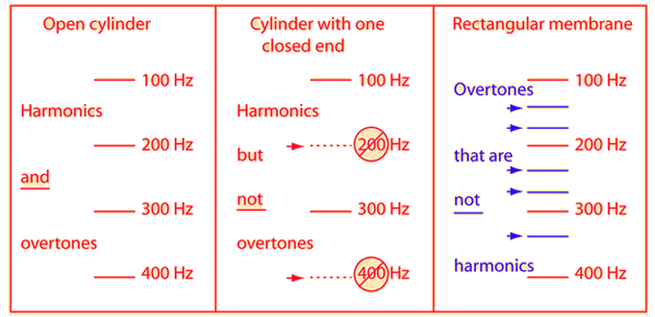 | Overtones and Harmonics The term harmonic has a precise meaning - that of an integer (whole number) multiple of the fundamental frequency of a vibrating object. The term overtone is used to refer to any resonant frequency above the fundamental frequency - an overtone may or may not be a harmonic. Many of the instruments of the orchestra, those utilizing strings or air columns, produce the fundamental frequency and harmonics. Their overtones can be said to be harmonic. Other sound sources such as the membranes or other percussive sources may have resonant frequencies which are not whole number multiples of their fundamental frequencies. They are said to have non-harmonic overtones.    | Index