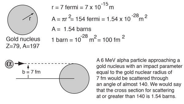 Scattering Cross SectionThe concept of cross section, as its name suggests, is that of effective area for collision. The cross section of a spherical target is ![]() The units of cross section are then area units, but for nuclear scattering the effective area is on the order of the cross sectional area of a nucleus. For a gold nucleus of mass number A=197, the radius determined from the nuclear radius relationship is about 7 fermis. ![]() The most common unit for cross section for nuclear scattering interactions is the barn. The cross section in barns for alpha scattering above a selected angle is a standard part of the analysis of Rutherford scattering. In the case of 6 MeV alpha particles scattered from a gold foil, for example, you don't know the impact parameter for any given alpha particle, so the calculation of the scattered fraction takes on a statistical character. For alpha particles bombarding a gold foil of thicknes 1 micrometer, less than 1 in 100,000 would meet the conditions for scattering at over 140°. The cross section for scattering at smaller angles will be larger, because the alpha doesn't have to come as close to be scattered through the smaller angle. For example, the cross section for scattering through 90° or above is 11.3 barns. For neutron scattering, there is no coulomb repulsion, so there is no appreciable scattering unless the impact parameter is less than the effective radius for the strong interaction. Therefore for a given target geometry the cross sections are smaller, typically measured in millibarns. Since the probability for interaction depends upon the strength and range of the interaction, the cross-sections for neutrino interactions are very small since they interact only by the weak interaction.