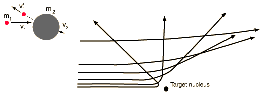 Conditions for large angle scatteringRegardless of the nature of the force in an elastic collision, to get a scattering angle greater than 90 degrees, the target must be more massive than the projectile. ![]() |