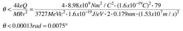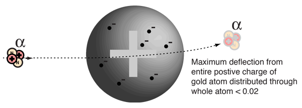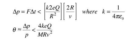 Alpha Scattering by Charge CloudThe Rutherford scattering experiment put to rest the Thomson model of the atom, because it could be shown that a positive charge distributed throughout the classical volume of the atom could not deflect the alpha particles by more than a small fraction of a degree. ![]() The calculation of an upper bound on the change in momentum Δp for the alpha particle can be approached in terms of the impulse of force relationship FΔt = Δp. Making use of the Coulomb force expression: ![]() For the specific case of the 4.87 MeV alpha particle from radium-226, this estimate of the angle becomes ![]() This calculation uses the radius 0.179 nm for the gold atom from the periodic table. It also includes the following velocity for the alpha particle calculated from the non-relativistic kinetic energy expression. ![]() The insight gained by Rutherford and his research team, including Geiger and Marsden, was that the current picture of the atomic volume as being filled with positively charged matter could not be correct since they saw alpha deflections of more than 90°. It also told them that with radii much smaller than the atom, they could get large deflections. So this table-top experiment gave birth to the picture of the atomic nucleus as a small central core of positively charged matter, and the reasoning followed from strictly classical physics. |