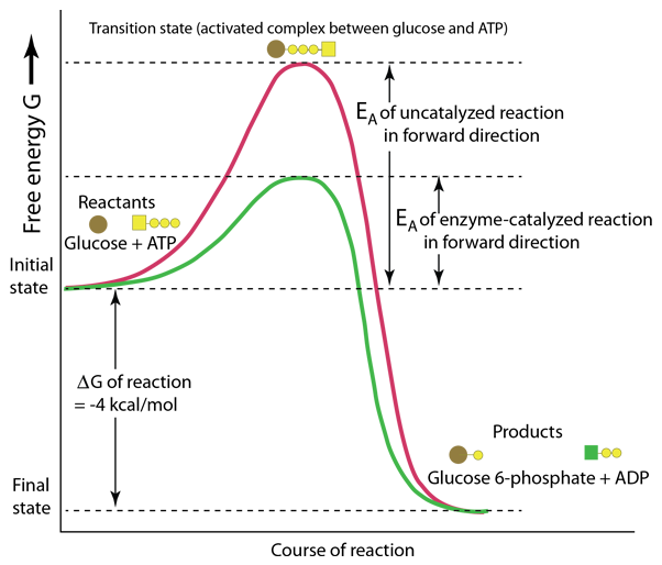 EnzymesEnzymes in biochemistry are regulatory proteins that assist in many of the reactions and processes in living cells. The DNA of a cell contains the master plan for the creation of the enzymes that are needed for life processes, and the enzymes assist in the replication of DNA and in fact help with making other copies of themselves and other proteins. One perspective on enzymes is that they facilitate many chemical reactions that otherwise would be too slow to sustain living systems. Examples have been found where an enzyme increased the rate of a biochemical reaction by more than a billion-fold! They may have binding sites which hold two or more other molecules to facilitate their binding to one another and also a binding site for ATP to provide the energy necessary for accomplishing the bonding. ![]() This representation of enzyme action is patterned after Karp. It pictures the action of the enzyme hexokinase in the first step of the glycolysis pathway for the breakdown of glucose. The course of the reaction is plotted in terms of the Gibbs free energy G and it can be seen that this reaction proceeds in the forward direction since the final free energy is 4 kcal/mole lower than the initial state. However, the course of such reactions require energy to break and/or make chemical bonds, so energy is typically required as an activation energy EA to produce the transition state between the initial and final states. The remarkable protein enzymes such as hexokinase are made only in living cells and are very specific to the reactions which they catalyze. In this example the enzyme action facilitates the formation of the transition state and lowers the amount of energy required to reach this state. A brief summary of the properties of such enzymes: