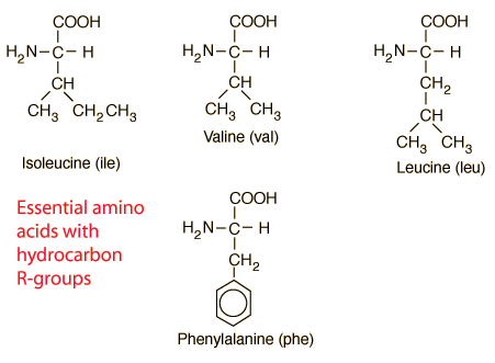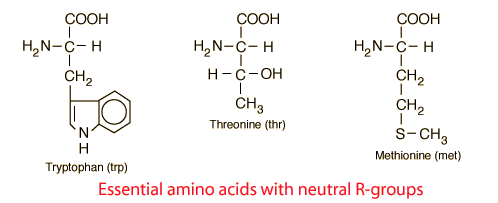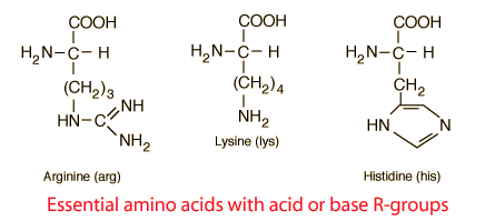 Essential Amino AcidsAmino acids are organic compounds which contain both an amino group and a carboxyl group. According to Tillery, et al., the human body can synthesize all of the amino acids necessary to build proteins except for the ten called the "essential amino acids", indicated by asterisks in the amino acid illustrations. An adequate diet must contain these essential amino acids. Typically, they are supplied by meat and dairy products, but if those are not consumed, some care must be applied to ensuring an adequate supply. They can be supplied by a combination of cereal grains (wheat, corn, rice, etc.) and legumes (beans,peanuts, etc.). Tillery points out that a number of popular ethnic foods involve such a combination, so that in a single dish, one might hope to get the ten essential amino acids. Mexican corn and beans, Japanese rice and soybeans, and Cajun red beans and rice are examples of such fortuitous combinations. ![]() ![]() ![]() The University of Arizona's Biology Project gives the following summary:"The 10 amino acids that we can produce are alanine, asparagine, aspartic acid, cysteine, glutamic acid, glutamine, glycine, proline, serine and tyrosine. Tyrosine is produced from phenylalanine, so if the diet is deficient in phenylalanine, tyrosine will be required as well. The essential amino acids (that we cannot produce internally) are arginine (required for the young, but not for adults), histidine, isoleucine, leucine, lysine, methionine, phenylalanine, threonine, tryptophan, and valine. These amino acids are required in the diet. Plants, of course, must be able to make all the amino acids. Humans, on the other hand, do not have all the the enzymes required for the biosynthesis of all of the amino acids." The failure to obtain enough of even 1 of the 10 essential amino acids has serious health implications and can result in degradation of the body's proteins. Muscle and other protein structures may be dismantled to obtain the one amino acid that is needed. "Unlike fat and starch, the human body does not store excess amino acids for later use - the amino acids must be in the food every day."(Biology Project) |