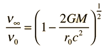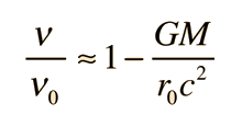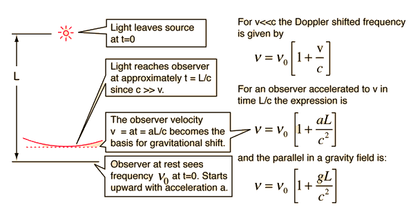 Gravitational Red ShiftAccording to the principle of equivalence from general relativity, any frequency shift which can be shown to arise from acceleration of a radiating source could also be produced by the appropriate gravitational field. If a photon of frequency υ0 is emitted radially outward from the surface of a gravitational mass M, then the photon energy observed at a distance from the mass will be observed to be lower, or "red shifted". If observed at a great distance, we could denote the observed frequency as υ∞. The result of general relativity using the Schwarzschild metric is ![]() which is valid for even strong gravitational fields. For weak gravitational fields or small displacements in a gravity field, one can make use of the approximation: ![]() to express the frequency shift between two locations as ![]() Where υ0 represents a photon emitted closer to the gravitational mass. This form made practical some laboratory experiments using nuclear sources with the gravitational term expressed in terms of the gravitational acceleration g on the Earth's surface. For the Harvard Tower experiment, the shifts in radiation frequency in the gravitational field were related to the relativistic doppler shift experienced from an accelerating light source. ![]() Gravity and the photon