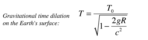 Time Dilation on EarthThe gravitational time dilation expression ![]() has such a small second term in the denominator that excessive numerical accuracy is required to evaluate it directly. Using a binomial expansion : ![]() so that the first approximation to the time expression is ![]() The numerical values were calculated using g = 9.8 m/s2, R = 6.38 x 106m (mean radius), and c= 3 x 108m/s. |