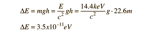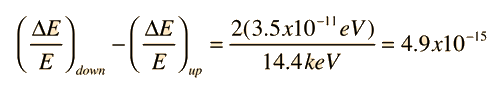 By just using the expression for gravitational potential energy near the Earth, and using the m in the relativistic energy expression, the gain in energy for a photon which falls distance h is ![]() Comparing the energy shifts on the upward and downward paths gives a predicted difference ![]() The measured difference was ![]() The success of this experiment owed much to the care of Pound and Rebka in preparing the source. They electroplated cobalt-57 onto the surface of a thin sheet of iron and then heated the combination at 1220 K for an hour. The heat treatment caused the cobalt to diffuse into the iron to a depth of about 300 nm or 1000 atomic spacings. The source was then mounted on the cone of a loudspeaker driven at 10Hz to sweep the source velocity in a sinusoidal variation. The detector was a thin sheet of iron about 14 micrometers thick which was also annealed. The heat treatments were found to be crucial in obtaining high resolution. |