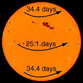 Being a gaseous body, the Sun does not have a single period of rotation like a rigid body. The sunspots provide a convenient reference for the measurement of the rotation period at different latitudes. The period of rotation averages 25.4 days, varying from 34.4 days at the poles to