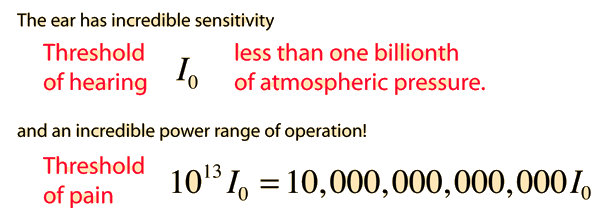 Threshold of HearingSound level measurements in decibels are generally referenced to a standard threshold of hearing at 1000 Hz for the human ear which can be stated in terms of sound intensity: ![]() or in terms of sound pressure: ![]() This value has wide acceptance as a nominal standard threshold and corresponds to 0 decibels. It represents a pressure change of less than one billionth of standard atmospheric pressure. This is indicative of the incredible sensitivity of human hearing. The actual average threshold of hearing at 1000 Hz is more like 2.5 x 10-12 watts/m2 or about 4 decibels, but zero decibels is a convenient reference. The threshold of hearing varies with frequency, as illustrated by the measured hearing curves.