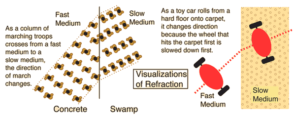 Refraction of SoundRefraction is the bending of waves when they enter a medium where their speed is different. Refraction is not so important a phenomenon with sound as it is with light where it is responsible for image formation by lenses, the eye, cameras, etc. But bending of sound waves does occur and is an interesting phenomena in sound ![]() These visualizations may help in understanding the nature of refraction. A column of troops approaching a medium where their speed is slower as shown will turn toward the right because the right side of the column hits the slow medium first and is therefore slowed down. The marchers on the left, perhaps oblivious to the plight of their companions, continue to march ahead full speed until they hit the slow medium. Not only does the direction of march change, the separation of the marchers is decreased. When applied to waves, this implies that the direction of propagation of the wave is deflected toward the right and that the wavelength of the wave is decreased. From the basic wave relationship, v=fλ , it is clear that a slower speed must shorten the wavelength since the frequency of the wave is determined by its source and does not change. Another visualization of refraction can come from the steering of various types of tractors, construction equipment, tanks and other tracked vehicle. If you apply the right brake, the vehicle turns right because you have slowed down one side of the vehicle without slowing down the other.