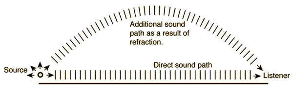 Sound propagates in all directions from a point source. Normally, only that which is initially directed toward the listener can be heard, but refraction can bend sound downward. Normally, only the direct sound is received. But refraction can add some additional sound, effectively amplifying the sound. Natural amplifiers can occur over cool lakes. ![]()