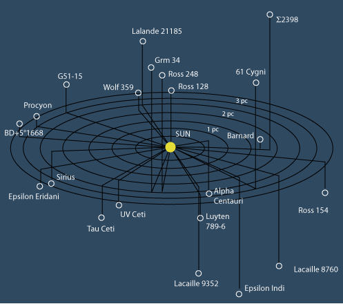 Stellar Neighbors of the Sun![]() This illustration is patterned after Chaisson and McMillan, Chapter 17, where they identify the closest stellar neighbors of the Sun. The closest star to the sun is Proxima Centauri, but its brighter neighbor Alpha Centauri, a double star, is so nearly the same distance that data about it are usually given. It is about 4 light years distance, or about 3.8x1016 m. |