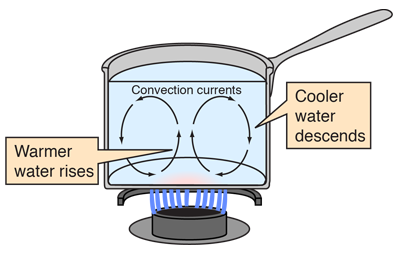 | Convection can also lead to circulation in a liquid, as in the heating of a pot of water over a flame. Heated water expands and becomes more buoyant. Cooler, more dense water near the surface descends and patterns of circulation can be formed, though they will not be as regular as suggested in the drawing.