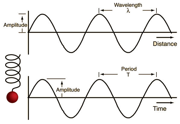 | Sinusoidal WavesA single- frequency traveling wave will take the form of a sine wave as a function of distance. The top sine wave in the illustration below is such a sine wave, a transverse wave typical of that caused by a small pebble dropped into a still pool.  The bottom sine wave in the illustration above is a sine wave as a function of time. Such a wave would be produced by plotting the position vs time of a mass on a spring undergoing simple harmonic motion. Or, if the mass on the spring is carried at a constant speed across a room, its position would trace out a sine wave as a function of distance. Sine waves can be represented mathematically and it can be shown that any wave can be constructed from an appropriate combination of sine waves (Fourier synthesis). | Index Wave concepts Resonance concepts | ||