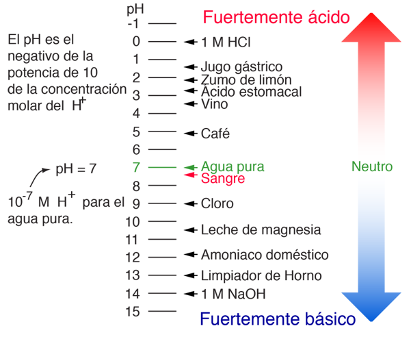 Ejemplos de Valores de pHEl pH de una solución es una medida de la concentración molar de iones de hidrógeno en la solución y, como tal, es una medida de la acidez o la basicidad de la solución. Las letras pH vienen de "potencia de hidrógeno" y el valor numérico se define como el negativo del logaritmo en base 10 de la concentración molar de los iones H+. El rango normal de valores de pH encontrados es de 0 a 14, siendo 0 el valor del ácido clorhídrico concentrado (HCl 1 M), 7 el valor para el agua pura (pH neutro), y 14 el valor del hidróxido de sodio concentrado (NaOH 1 M). Es posible conseguir un pH de -1 con HCl 10 M, pero se trata de un límite práctico de acidez. En el otro extremo, una solución 10 M de NaOH tendría un pH de 15. ![]() En el agua pura, la concentración molar de iones de H+ es de 10-7 M y la concentración de iones OH-, tambien es 10-7 M. En realidad, si se mira en detalle, es más preciso clasificar las concentraciones, como las de [H3O]+ y [OH]-. El producto de las concentraciones de iones positivos y negativos es 10-14 en cualquier solución acuosa a 25°C. Un ejemplo importante de pH es el de la sangre. Su valor nominal de pH = 7,4 es regulado con gran precisión por el cuerpo. Si el pH de la sangre se va fuera del rango de 7,35 a 7,45, los resultados pueden ser graves e incluso mortales. Si se mide el pH del agua del grifo con un medidor de pH, es posible sorprenderse de lo lejos que está de un pH de 7, a causa de las sustancias disueltas en el agua. Para obtener un pH cercano a 7, se necesita agua destilada. Los medidores del pH pueden dar valores numéricos precisos, pero se pueden obtener valores aproximados con diferentes indicadores. El papel tornasol rojo y azul ha sido uno de los indicadores comunes. El papel tornasol rojo se vuelve azul a un pH básico de alrededor de 5, y el papel de tornasol azul se vuelve rojo a un pH ácido de alrededor de 8. Ninguno cambia de color si el pH es casi neutro. El tornasol es un compuesto orgánico derivado de los líquenes. La fenolftaleína es también un indicador común, siendo incolora en solución con pH por debajo de 8, y cambiando a un color rosa para un pH por encima de 8.