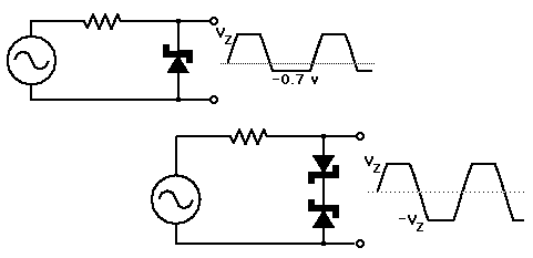Limitador ZenerUn simple diodo Zener puede limitar un lado de una forma de onda sinusoidal al voltaje del Zener, mientras mantiene cerca de cero el otro lado de la onda. Con dos zeners opuestos, la forma de onda se puede limitar al voltaje del zener sobre ambas polaridades. ![]() |