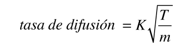 Velocidad de DifusiónPuesto que la energía cinética media de los diferentes tipos de moléculas (masas diferentes) que están en equilibrio térmico es la misma, entonces sus velocidades medias son diferentes. Su velocidad de difusión media, se espera que dependa de esa velocidad media, la cual le da una velocidad de difusión relativa ![]() donde la constante k depende de factores geométricos, incluyendo el área transversal donde tiene lugar la difusión. La velocidad de difusión relativa para dos especies moleculares diferentes, está dado entonces por ![]() |