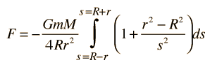 Fuerza de gravedad dentro de una esfera hueca![]() Para la aplicación de la ley de la gravedad dentro de una esfera hueca uniforme de masa M, se elige un punto sobre el eje de una tira circular de masa. El problema se plantea, dividiendo en capas delgadas infinitesimalmente la superficie de la esfera de densidad σ por unidad de área. Se obtiene así anillos circulares de anchura infinitesimal. La elección de tal punto no conlleva ninguna pérdida de generalidad, porque para cualquier punto dentro de la esfera, los elementos de masa se pueden elegir, tal que el punto esté sobre el eje de simetría. Para establecer la integral necesaria, se usa el triángulo de arriba, donde aprovechamos la simetría del sistema. Todas las componentes de la fuerza de la gravedad perpendicular a r, se cancelarán por simetría, y todas las componentes a lo largo de r, sumarán. El elemento de fuerza diferencial sobre la masa m se puede escribir ![]() donde el elemento diferencial de masa dM es dado por ![]() La fuerza ejercida por la entera esfera hueca se puede expresar como una integral sobre el ángulo θ ![]() Para evaluar la integral, las variables s y α se deben expresar en términos del ángulo θ . Usando la Ley de los cosenos con el ángulo interior θ da ![]() y esto se puede diferenciar para dar ![]() Ahora, usando la ley de los cosenos para el ángulo externo α: ![]() Con estas relaciones, podemos expresar la integral en términos de s en vez de θ. Hasta este punto, el tratamiento ha sido igual que el empleado para un punto fuera de la esfera, pero ahora la forma de los límites son diferentes. Para θ = 0, s = R - r, y para θ = π, s = r + R . ![]() Usando la expresión de densidad de área σ = M/4πR2, the integral can be written ![]() Ahora, las partes se evaluan como integrales polinómicas y simplificado. ![]() ¡La fuerza de gravedad neta ejercida sobre una masa puntual, situada en el interior de una masa esférica hueca es exactamente cero! Físicamente esto supone un resultado muy importante porque cualquier distribución de masa esférica y simétrica, fuera de la posición de la masa de prueba m, se puede construir como una serie de tales esferas. Esto prueba que la fuerza de gravedad de cualquier distribución de masa esférica y simétrica dentro de su radio es cero. Si una masa dada m está en el interior de un distribución de masa esférica y simétrica, la parte de la masa fuera de su radio no contribuye con ninguna fuerza neta.
