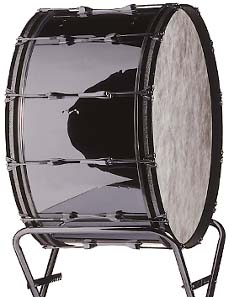 El bombo tiene generalmente un diámetro de 50-100 cm y membranas en ambas bases del cuerpo cilíndrico. Aunque el bombo no tiene un centro de afinación bien definido, es una práctica común sintonizar el modo más bajo de las dos cabezas, sobre una cuarta musical de separación. El acoplamiento entre las dos cabezas del bombo produce una separación de los dos modos más bajos, los modos 0,1 y 1,1. Nótese que el valor de la constante en la ecuación anterior de la frecuencia asume que se utilizan unidades MKS, como en el cálculo de la membrana circular. |