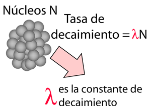 | El tiempo para que decaiga (desintegre) un núcleo dado, es impredecible y aleatorio, pero la tasa de decaimiento de una muestra no es aleatorio, sino que depende de detalles de la estructura nuclear, implicada en la constante de decaimiento. Una muestra considerable, tendrá una fracción significativa del número de Avogadro de núcleos, y las estadísticas de tal decaimiento, siguen un patrón preciso de decaimiento exponencial. |