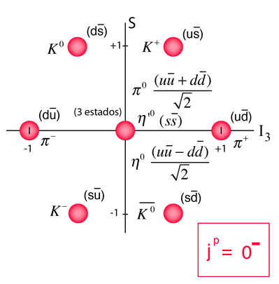 Los mesones pseudo-escalares tienen los espines de los quarks y antiquarks anti-alineados y momento angular orbital cero, resultando en j=0. Tienen paridad negativa. Los diagramas están trazados con la extrañeza sobre el eje vertical y el isospín sobre el eje horizontal.