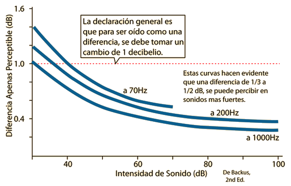 JND en la Intensidad de SonidoUna referencia útil de tipo general es que la diferencia apenas perceptible (JND) en la intensidad de sonido para el oído humano es de aproximadamente 1 decibelio. De hecho, el uso del factor de 10 en la definición del decibelio es crear una unidad que sea aproximadamente el mínimo cambio detectable en la intensidad del sonido. Habiéndose establecido lo anterior, se puede señalar que hay algunas variaciones. La JND es de aproximadamente 1 dB para sonidos suaves alrededor de 30-40 dB en frecuencias bajas y medias. Puede caer a 1/3, o a 1/2 de decibelio para los sonidos fuertes. Se debe tener cuidado en la aplicación del criterio "un decibelio". Se supone que se está aumentando el mismo sonido en un decibelio. Si se añade un sonido fuera de la banda crítica de la frecuencia de este sonido, podría estar excitándose nuevas terminaciones nerviosas, y no se puede presumir que se aplique la regla de 1 decibelio. Esto causa cierta preocupación acerca de los esquemas de codificación perceptuales con la grabación digital moderna, que podría eliminar algún contenido significativo audible, por el uso del criterio de "un decibelio" en el contenido marginal.