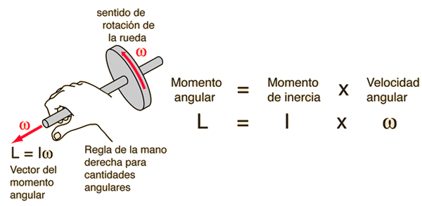 Momento AngularEl momento angular de un sólido rígido, se definee como el producto del momento de inercia por la velocidad angular. Es análogo al momento lineal y está sujeto a las restricción del principio fundamental de la conservación del momento angular si no actuan pares externos sobre el objeto. El momento angular es una cantidad vectorial. Se deriva de la expresión del momento angular de una partícula ![]()