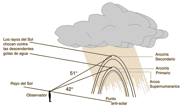 ArcoírisEl arcoíris es el resultado de la refracción de la luz del Sol sobre las gotas de agua de la lluvia, mas la reflexión de la luz sobre la parte posterior de las gotas. ![]() ![]() Si cuando está lloviendo, se puede ver la sombra de nuestra propia cabeza, se está en posición de poder ver un arcoíris si las condiciones son favorables. El arcoíris forma un arco circular alrededor del punto anti-solar, el cual está en la sombra de nuestra cabeza. Para ver un arcoíris, se puede buscar la sombra de nuestra cabeza en una cascada, o incluso con el rociado de una regadera, o una manguera. (Foto de Dubby Waggoner, usada con permiso)