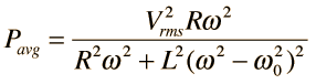 Potencia en un Circuito Resonante SerieLa potencia media disipada en un circuito resonante serie se puede expresar en función de los voltajes y corrientes rms como sigue: ![]() Usando las fórmulas de las reactancias inductivas y capacitivas, los términos que los relacionan, se puede expresar en función de la frecuencia ![]() ![]() ![]()