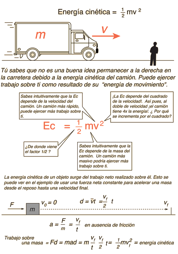 Concepto de Energía CinéticaLa energía cinética es energía del movimiento. La energía cinética de un objeto, es la energía que posee como consecuencia de su movimiento. La energía cinética de un punto de masa m está dada por ![]()