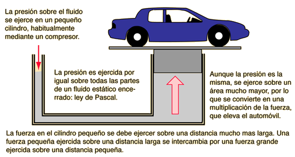 La elevación hidráulica de los automóviles, es un ejemplo de una fuerza multiplicada por la presión hidráulica, basada sobre el principio de Pascal. El fluido en un cilindro pequeño, se debe mover mucha mas distancia que la distancia de elevación del coche.