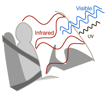 Las longitudes de ondas mas cortas de la luz ultravioleta son bloqueadas en gran parte por el cristal, puesto que tienen mayores energías cuánticas, y estas tienen mecanismos de absorción en el cristal. A pesar de que podamos estar incorfortablemente calentados por los rayos que atraviesan el parabrisas, no seremos quemados por el sol. |