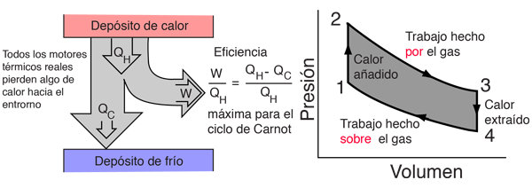 Motores TérmicosUn motor térmico usa típicamente energía proporcionada en forma de calor, para hacer trabajo, y luego expulsa el calor que no se pudo usar. La termodinámica es el estudio de las relaciones entre calor y trabajo. La primera ley y la segunda ley de la termodinámica, restringen la operación de un motor térmico. La primera ley es la aplicación de la conservación de la energía al sistema, y la segunda establece los límites de la posible eficiencia de la máquina, y determina la dirección del flujo de la energía. ![]() Los motores térmicos en general, se pueden describir por el modelo de reservas (izquierda) o por el diagrama PV (derecha) |