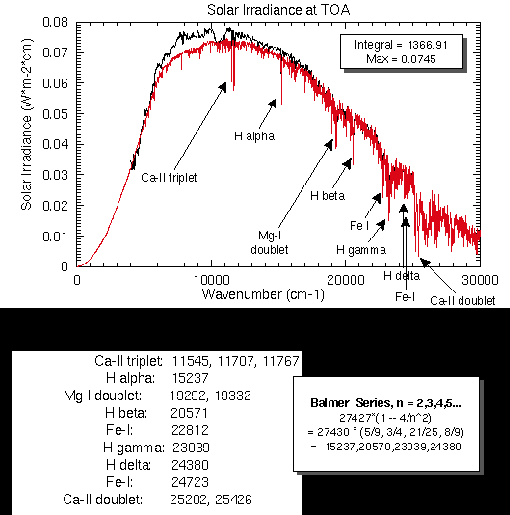 Radiación Solar![]() Esta es una representación gráfica realizada con datos estándares de la NASA, sobre el espectro de radiación del disco solar en vatios/m2μm. La curva superior está formada por la unión de puntos de datos de fuera de la atmósfera. La curva inferior se atribuye a la superficie de la Tierra, bajo la condición designada como "masa de aire 2". Esta designación corresponde a un ángulo de 60° entre el cénit y el Sol. Los datos de la superficie corresponden a Brandhorst, et al., Procedimientos Provisionales de Ensayo de células solares para aplicaciones terrestres, NASA Rep. TM X-71771 (Lewis Research Center) 1975. Los puntos se han calculado realmente usando datos de fuera de la atmósfera, asumiendo un contenido de agua de 20 mmHg y de ozono 3.4 mm Hg. Los datos de fuera de la atmósfera, son de Thekaekara, M. P., Solar energy outside the earth's atmosphere, Solar Energy 14, 109 (1973). ![]() Esto representa una valoración posterior de la radiación solar, mostrada en rojo. Es también una ilustración de la NASA, con cálculos de líneas espectrales acreditadas a Bob Kurucz del Observatorio Smithsonian de Harvard. Es considerada como la mejor estimación del espectro solar posterior a 1992.