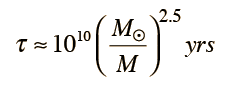 Stellar LifetimesThe luminosity of a star is a measure of its energy output, and therefore a measure of how rapidly it is using up its fuel supply. The lifetime of a star would be simply proportional to the mass of fuel available divided by the luminosity if the luminosity were constant. Beyond these statements, one must rely on the empirical data collected and models of that data to estimate the lifetime of a given star. One useful step toward modeling stellar lifetimes is the empirical mass-luminosity relationship. ![]() Since the mass of the star is the fuel for the nuclear fusion processes, one could then presume that the lifetime on the main sequence is proportional to the stellar mass divided by the luminosity. It depends upon the fraction of mass that is actually available as nuclear fuel, and considerable effort has gone into modeling that fraction for the Sun to yield a solar lifetime of 10 x 109 years. Using that projected lifetime, the stellar lifetime can then be expressed as ![]() |