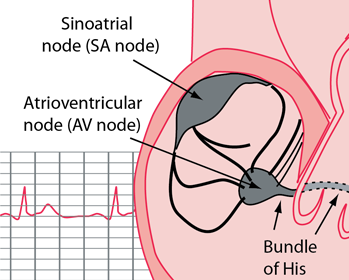 In the upper part of the right atrium of the heart is a specialized bundle of neurons known as the sinoatrial node (SA node). Acting as the heart's natural pacemaker, the SA node "fires" at regular intervals to cause the heart of beat with a rhythmn of about 60 to 70 beats per minute for a healthy, resting heart. The electrical impulse from the SA node triggers a sequence of electrical events in the heart to control the orderly sequence of muscle contractions that pump the blood out of the heart.