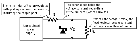 The constant reverse voltage of the zener diode makes it a valuable component for the regulation of the output voltage against both variations in the input voltage from an unregulated power supply or variations in the load resistance. The current through the zener will change to keep the voltage at within the limits of the threshold of zener action and the maximum power it can dissipate.