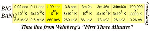 ![]() Density 4 x 109 Universe is mostly light (photons ) "...it was light that then formed the dominant constituent of the universe, and ordinary matter played only the role of a negligible contaminant." Reminiscent of "Let there be light...". Electrons and positrons created from light (pair -production ) and destroyed by annihilation at about equal rates. The pair-production threshold is 1 MeV, so the thermal energy kT=8.6 MeV was well above that. Protons and neutrons being changed back and forth, so about equal numbers. The energy difference between neutron and proton is 1.29 MeV, so protons can be freely changed to neutrons at this temperature. Only about one baryon for 109 photons, as inferred from the 3K background and density estimates. Since the conservation of baryon number is a strong conservation principle, it is inferred that the ratio of photons to baryons is constant throughout the process of expansion.