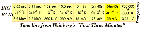 ![]() Time:34min40s, Temperature: 3x108 K Density 10 Nuclear processes are stopped, expansion and cooling continues. About 1 in 109 electrons left because of slight excess of electrons over positrons in primeval fireball. The reason for the excess of matter over antimatter is a continuing investigation. Energy density is about 69% photons, 31% neutrinos. |