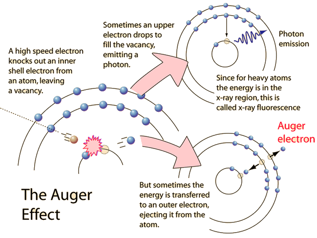 If an inner shell electron is removed from an atom, an electron from a higher level will quickly make the transition downward to fill the vacancy. Sometimes this transition will be accompanied by an emitted photon whose quantum energy matches the energy gap between the upper and lower level. Since for heavy atoms this quantum energy will be in the x-ray region, it is commonly called x-ray fluorescence. This emission process for lighter atoms and outer electrons gives rise to line spectra. In other cases, the energy released by the downward transition is given to one of the outer electrons instead of to a photon, and this electron is then ejected from the atom with an energy equal to the energy lost by the electron which made the downward transition minus the binding energy of the electron that is ejected from the atom. Though more involved in interpretation than optical spectra, the analysis of the energy spectrum of these emitted electrons does give information about the atomic energy levels. The Auger effect bears some resemblance to internal conversion of the nucleus, which also ejects an electron.