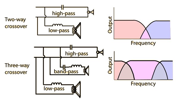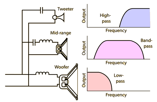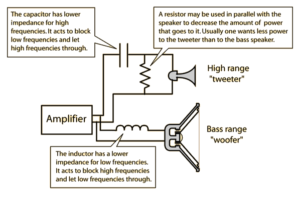 Combinations of capacitors, inductors, and resistors can direct high frequencies to the tweeter and low frequencies to the woofer. This amounts to filter action. A three-way crossover network divides the frequency range between three speakers.
