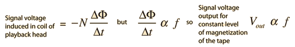Equalization for Tape PlaybackWhen a magnetic image of a sound signal is recorded onto tape with optimum bias, the magnetization of the tape is linearly proportional to the signal voltage applied to the head. The playback process, depends not only upon the magnetization of the tape which passes under the playback head but also upon its frequency. By Faraday's law: ![]() The output signal voltage then increases by a factor of two for each octave rise in frequency f, so an equalization circuit must be employed to reduce the signal back to proper balance. A factor of two in voltage is 6 decibels in power, so the equalization circuit must increase its attenuation 6 dB per octave. |