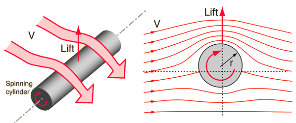 Kutta-Joukowski Lift Theorem![]() Two early aerodynamicists, Kutta in Germany and Joukowski in Russia, worked to quantify the lift achieved by an airflow over a spinning cylinder. The lift relationship is where ρ is the air density, V is the velocity of air flow relative to the cylinder, and G is called the "vortex strength". The vortex strength is given by where ω is the angular velocity of spin of the cylinder. This can also be described as the surface speed (speed Vr = ωr of the surface associated with the rotation) times the circumference of the cylinder. Like all aerodynamic lift, this seems a bit mysterious, but it can be looked at in terms of a redirection of the air motion. If the cylinder traps some air in a boundary layer at the cylinder surface and carries it around with it, shedding it downward, then it has given some of the air a downward momentum. That can act to give the cylinder an upward momentum in accordance with the principle of conservation of momentum. Another approach is to say that you have exerted a downward component of force on the air and by Newton's 3rd law there must be an upward force on the cylinder. Yet another approach is to say that the top of the cylinder is assisting the airstream, speeding up the flow on the top of the cylinder. Then by the Bernoulli equation, the pressure on the top of the cylinder is diminished, giving an effective lift. |