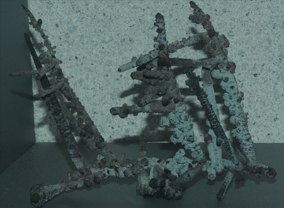 One of the more unusual forms is exhibited in this cross-section of a post which served as a support in a copper mine. It has been partially infilled and replaced by copper from the ground water in which it was submerged. The post is about 12 cm in diameter.