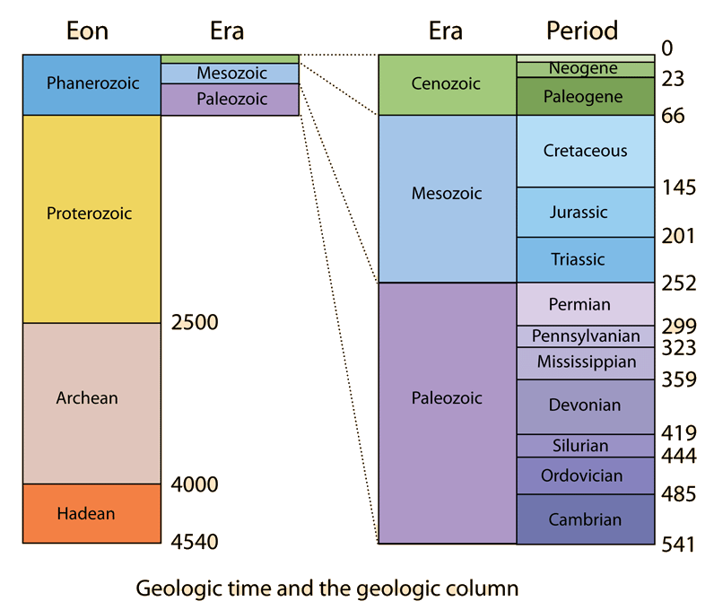 Geological time scaleThe vast expanse of geological time has been separated into eras, periods, and epochs. The numbers included below refer to the beginnings of the division in which the title appears. The numbers are in millions of years. The named divisions of time are for the most part based on fossil evidence and principles for relative dating over the past two hundred years. Only with the application of radiometric dating have numbers been obtained for the divisions observed from field observations.