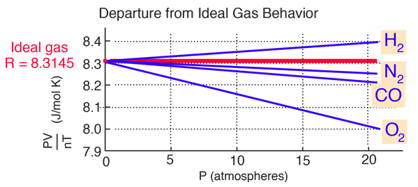 Since the constant b is an indication of molecular volume, it could be used to estimate the radius of an atom or molecule, modeled as a sphere. Fishbane et al. give the value of b for nitrogen gas as 39.4 x 10-6 m3/mol. This leads to the following estimate of radius: ![]() In the periodic table is found an atomic radius of 0.075 nm for nitrogen, so the above estimate for a nitrogen molecule is plausible. The plot below (after Fishbane, et al.) shows significant departure from the ideal gas law, about 3% in 20 atmospheres pressure for oxygen. The departure is measurable even at one atmosphere pressure, but not large. The fact that all gases extrapolate to the same value is the basis for the definition of the Kelvin temperature scale in terms of that limiting value. ![]() |