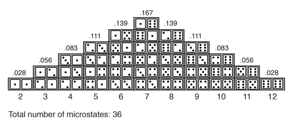 Statistics of Dice ThrowThe probababilities of different numbers obtained by the throw of two dice offer a good introduction to the ideas of probability. For the throw of a single die, all outcomes are equally probable. But in the throw of two dice, the different possibilities for the total of the two dice are not equally probable because there are more ways to get some numbers than others. There are six ways to get a total of 7, but only one way to get 2, so the "odds" of getting a 7 are six times those for getting "snake eyes". This simple example raises the idea of distinguishable states. For example, throwing a 3 is twice as likely as throwing a 2 because there are two distinguishable ways to get a 3. ![]() The probability of getting a given value for the total on the dice may be calculated by taking the total number of ways that value can be produced and dividing it by the total number of distinguishable outcomes. So the probability of a 7 on the dice is 1/6 because it can be produced in 6 ways out of a total of 36 possible outcomes.
