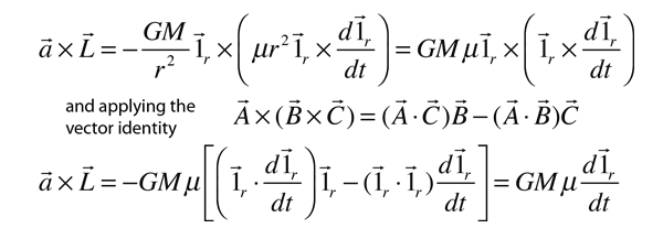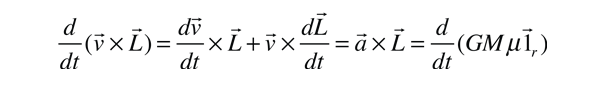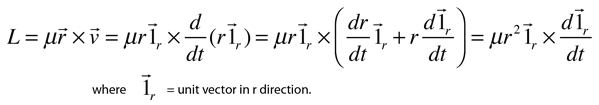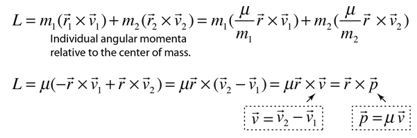 The individual vector coordinates of the masses can be expressed in terms of the reduced mass: ![]() Kepler's Laws depend upon the principle of conservation of angular momentum, and since these are inherently vector quantities, the angular momentum is expressed in terms of vector products. The angular momentum of the two body system can be expressed in terms of their relative velocity and the reduced mass of the system. Starting with the individual angular momenta, the angular momentum of the system L can be expressed as follows: ![]() This provides the necessary framework for showing that angular momentum is conserved for an orbiting planet or a member of a binary star system. This is done by showing that the derivative of the angular momentum is zero for the case where the force of attraction acts along the line between the two bodies. This requires the expression for the derivative of a product of functions. Using the expression for angular momentum L obtained above: